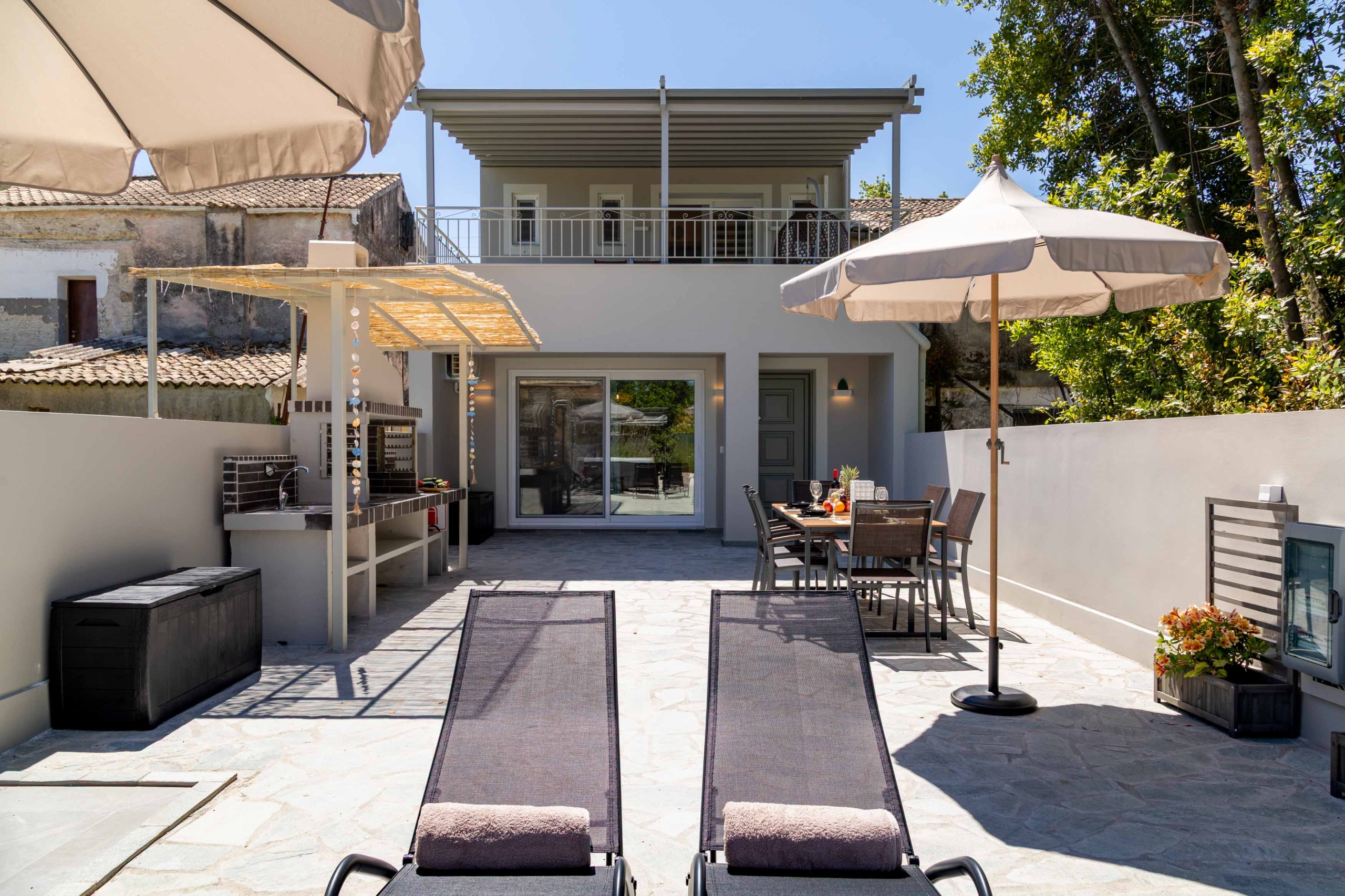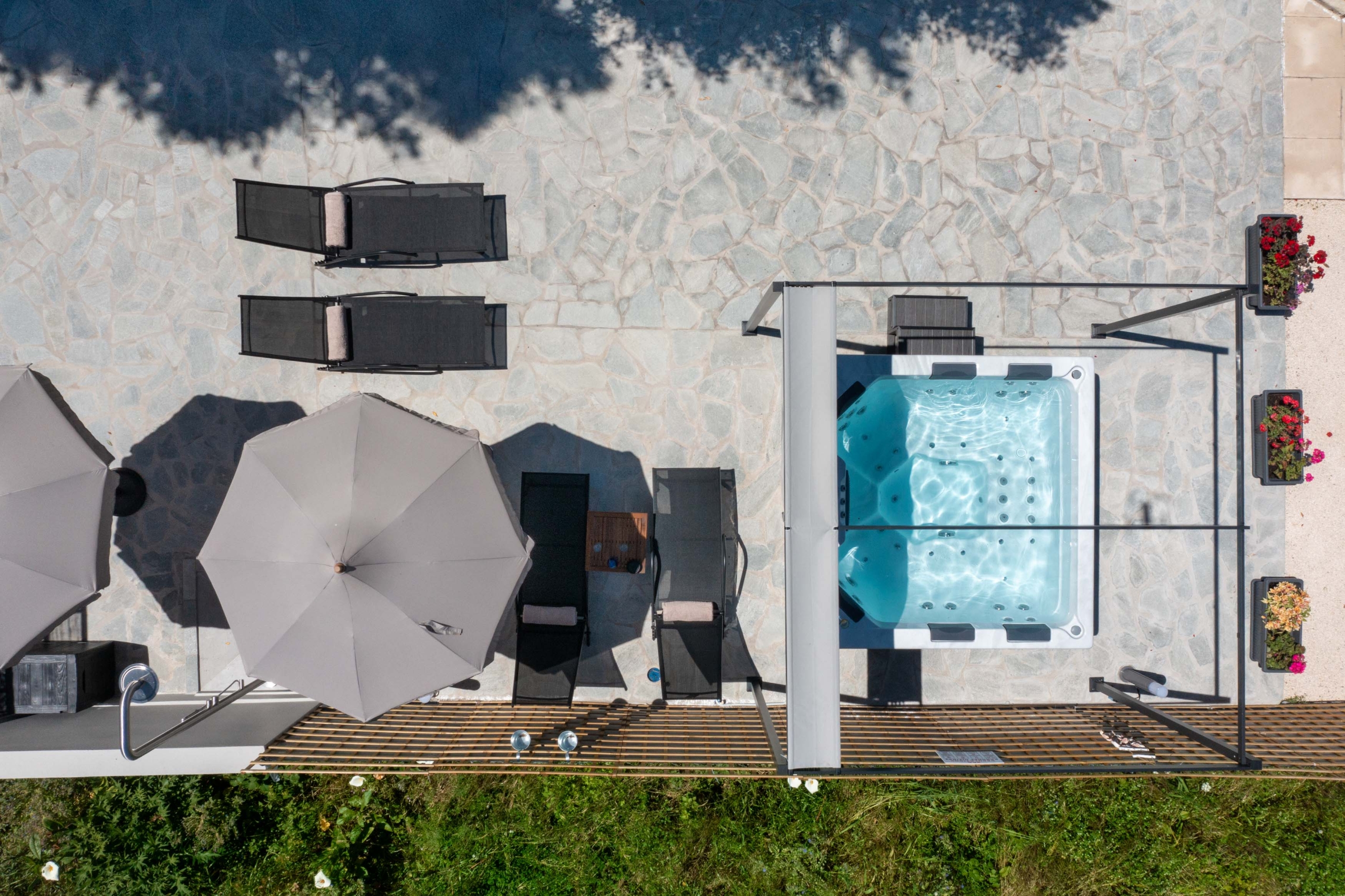 From above, the beauty of your retreat unfolds — a sunlit terrace surrounded by loungers, umbrellas, and the sparkling allure of a jacuzzi. Here, mornings begin with gentle breezes and golden light, while evenings fade into tranquil skies reflected in the water. The perfect setting to unwind, breathe, and feel truly at peace.